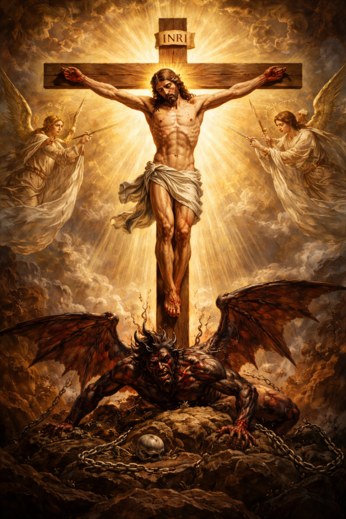 What appeared, to every earthly measure, as Christ’s defeat on the Cross was in fact the precise moment of Satan’s decisive undoing. The power of evil rests on accusation, fear, and the lie that God withdraws when suffering begins. At Calvary, those lies are exposed and emptied from the inside. Jesus Christ does not save by overpowering His enemies with force, but by refusing to become like them. Satan’s strategy—violence answered by violence, pride answered by pride, death answered by despair—fails completely when confronted with a love that will not retaliate, manipulate, or flee. On the Cross, sin exhausts itself; hatred reaches its limit; death overreaches and loses its claim. By freely accepting suffering without surrendering love, Christ breaks the logic by which evil operates. The devil seeks dominion through fear and coercion, but Christ reigns through self-gift, turning the very instrument of shame into a throne of mercy. This is why the Cross is victory disguised as loss: evil does its worst and finds it cannot destroy love, cannot silence truth, and cannot sever communion between God and humanity. What the world saw as an ending was the collapse of Satan’s last weapon—the belief that suffering proves abandonment. From that moment forward, even death itself is no longer absolute, because it has been entered, endured, and emptied by love that refused to turn away.