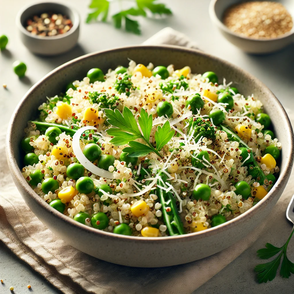 A fresh & vibrant quinoa bowl that combines fluffy cooked quinoa with tender peas, crisp corn, aromatics, and parmesan. The avocado oil brings richness, while the onion and seasonings build savory depth. Finished with a sprinkle of finely shredded parmesan and fresh parsley, this dish is light, nourishing, and incredibly versatile — perfect as a side, lunch bowl, or base for adding chicken, salmon, or tofu.