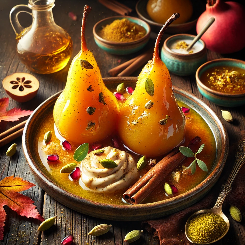 Exotic Warm Spiced Pears with Saffron, Rose, & Cardamom Syrup...